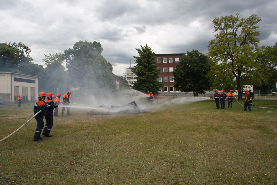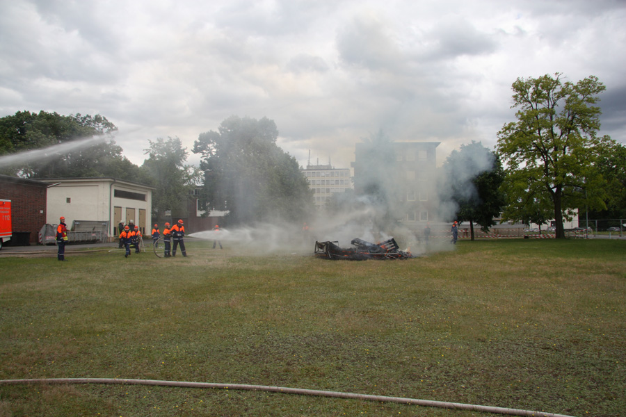 Ein Spaziergänger sieht Rauch aus einer Industriehalle aufsteigen und alarmiert über den Notruf 112 die Feuerwehr. Die ersten an der Halle eintreffenden Feuerwehreinheiten sehen sich einem ausgedehnten Gebäudebrand gegenüber. Sofort wird klar, dass weitere Einheiten aus dem gesamten Stadtgebiet erforderlich sind, um den Brand erfolgreich bekämpfen und noch nicht betroffene Gebäude schützen zu können.